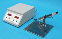 烧烫伤治疗药物的研究离不开动物烫伤模型的制作,烫伤模型制做的好坏又直接影响到对药物疗效的评价和鉴定。过去烧烫伤造模方法很多,有化学方法;化学灼伤法、物理法;物理法里又分为蒸汽烫伤、水浴烫伤、电弧灼伤和电热烫伤。经过我们潜心的研究、分析、对比,认为电热烫伤是最具有可控性、操作简单、重现性好,适用于大小动物,应是较理想的方法,为此我们着力在电热烫伤方面进行了深入的开发研究,解决了电烫方面的两大难题,一是烫伤深度问题,二是烫伤一致性的问题,为解决好以上问题,我们首先解决三个技术上的关键问题,一是温度控制:温度是烫伤的基本要素,温度控制的准确程度直接影响到烫伤的深度和烫伤的一致性,为此我们设计了精确的控温系统,将仪器烫头的表面温度控制在±0.1度的范围之内,并最大限度地提高烫头的容温性,保证烫头接触动物皮肤后,温降达到最小值。二是时间控制,电烫的时间准确与否也直接影响到烫伤的深度和烫伤的一致性,为此我们将仪器计时精确到0.01秒,并设置了自动开始计时系统和计时结束自动报警提示功能,即电烫头一接触动物皮肤就开始自动倒计时,结束时蜂鸣提示。三是烫头触压力,烫头对皮肤的触压力的大小也会直接影响到烫伤的深度和烫伤的一致性(因触压皮肤越紧,热传导的越快,烫伤深度就越大),为此我们设计了触压力调整结构,可以根据不同的动物,选择不同的触压力,设置简单、调整方便。通过对这三部位的理想设计,该仪器达到了制作理想烫伤制模的要求,在实际的使用中也确实达到了烫伤深度的可控性和烫伤模型的一致性的要求。仪器在整体设计上一切从实用出发,设计了四种不同面积的烫头,可根据实验动物和实验要求的不同随时更换,同时还设计了小动物趴伏板,一人就可以对小动物进行实验。