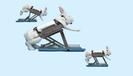 兔是生理、药理、毒理实验和教学中最常用的动物之一,常用于发热研究、热源试验、免疫学研究、呼吸系统疾病研究、眼科学研究和皮肤反应试验等等。由于兔子体型适中,性情温顺,所以可以多途径地给药:口服、皮下、椎管、静脉、呼吸道、直肠、皮肤、眼睛、脑内等等,同时可多方式地采集血液、尿液、胃液等,仅血液采集就可分为兔耳缘静脉取血、耳中动脉取血、后肢胫部皮下静脉取血、股静脉取血、颈静脉取血和心脏取血等多种形式,所以说兔子在医学研究实验中有着重要的用途。但要在清醒状态下把兔子固定成适合多种实验的方式却是一直成为实验人员头痛的问题,如药物灌胃、胫部取血、体温测量、尿液导出、皮肤实验等往往都是多人联手操作才能完成。仅灌胃就要两人按住兔子,一人开口插管,有时还出现失败,被抓伤的情况也时有发生,兔子灌胃已成为一项艰巨的工作任务,如何把这些艰难的工作变的轻松,最近我们自主研发了专利产品YLS-Q3多功能兔固定架,成功地解决了清醒状态下的兔子固定问题,深受实验人员的喜爱,解决了兔子灌胃、采血、导尿、呼吸、眼睛和皮肤实验等问题,是非常理想的实验器材。